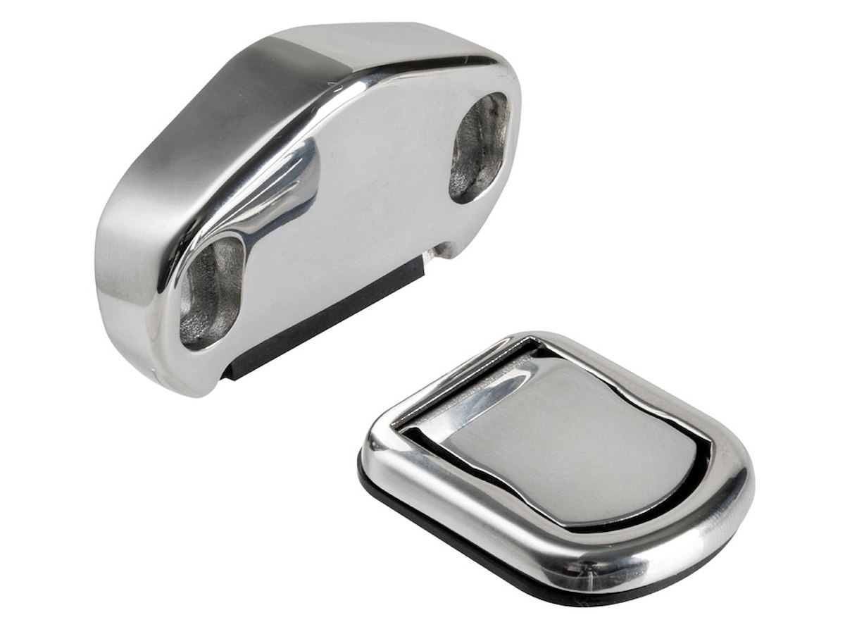Fermaporte magnetico composto da due componenti: blocco porta con magnete inclinato a 18° e blocco a terra con piastrina a scomparsa.