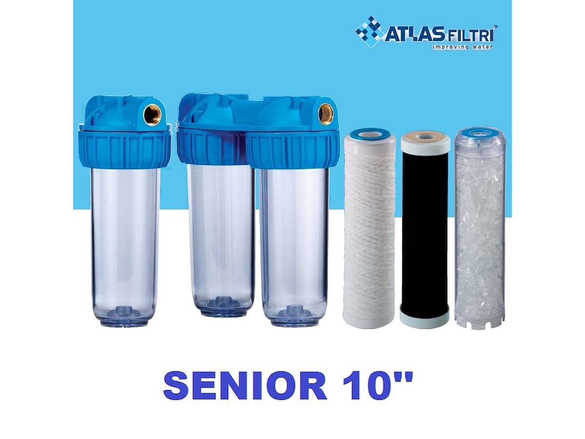 sistema per filtraggio acque composto da contenitore con bicchiere trasparente, attacchi femmina da 3/4 con inserti in ottone, componibile con setto filtrante in filo avvolto per le impurità dell'acqua o in carbone attivo con effetto anti-microbico o con cristalli di polifosfato anti-calcare