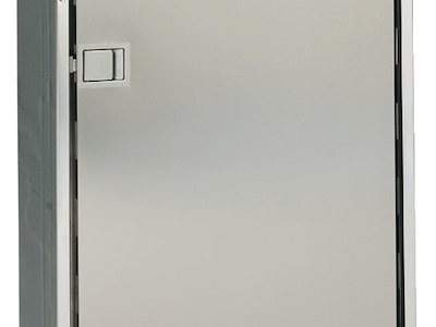 E’ già completo di flangia di fissaggio ad incasso inox e la porta resta a filo della flangia. La chiusura é garantita da una serratura a scatto anche essa a filo.