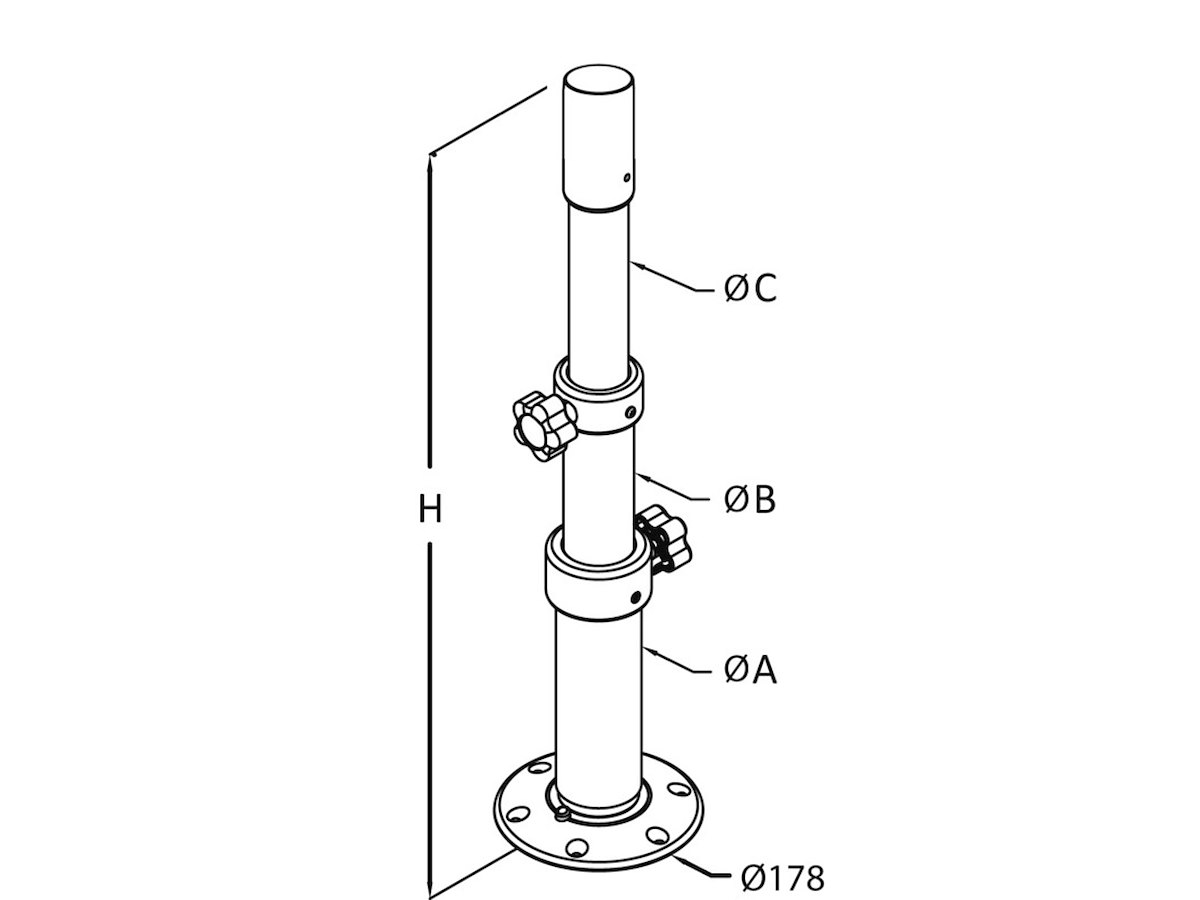 Senza base superiore, si incastra direttamente dell'alloggiamento dei tavoli 48.417.50/51/52. Fabbricate in alluminio anodizzato. La colonna si avvita sulla base con ingegnoso sistema "Thread lock" estremamente stabile . La base si fissa al pagliolo senza incasso , con una sporgenza di soli 20 mm.