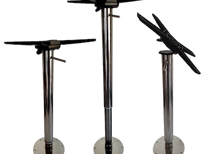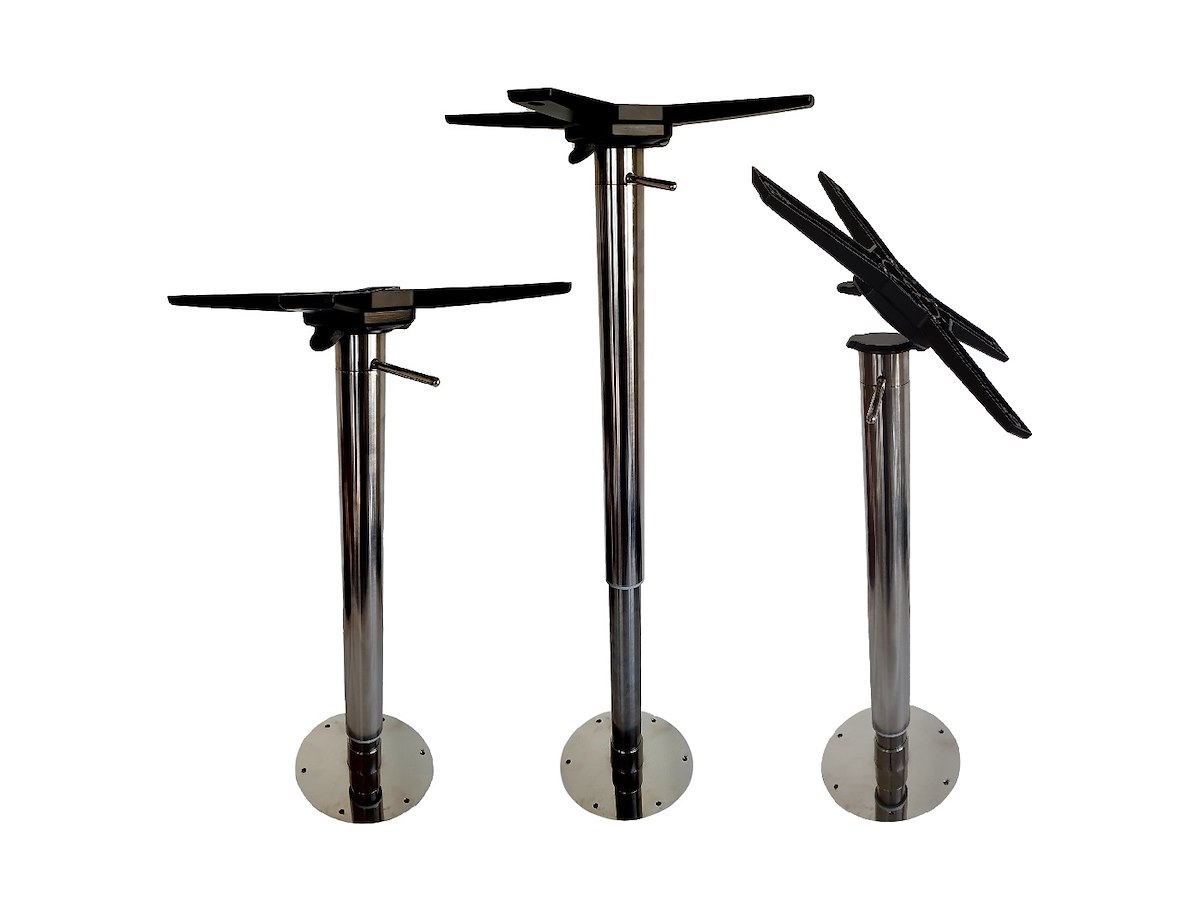 base tavolo telescopica a pistone in Acciaio inox rilucidata, ribaltabile con basamento in alluminio strutturale, escursione a Gas da 700 mm a 1000mm, apertura a 90° meccanica, Asta di regolazione in Inox, basamento sopra coperta ad incastro con innesto su bussola ricavata dal pieno conica