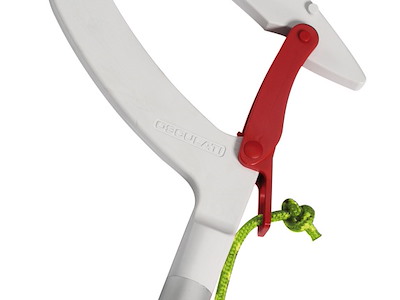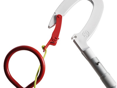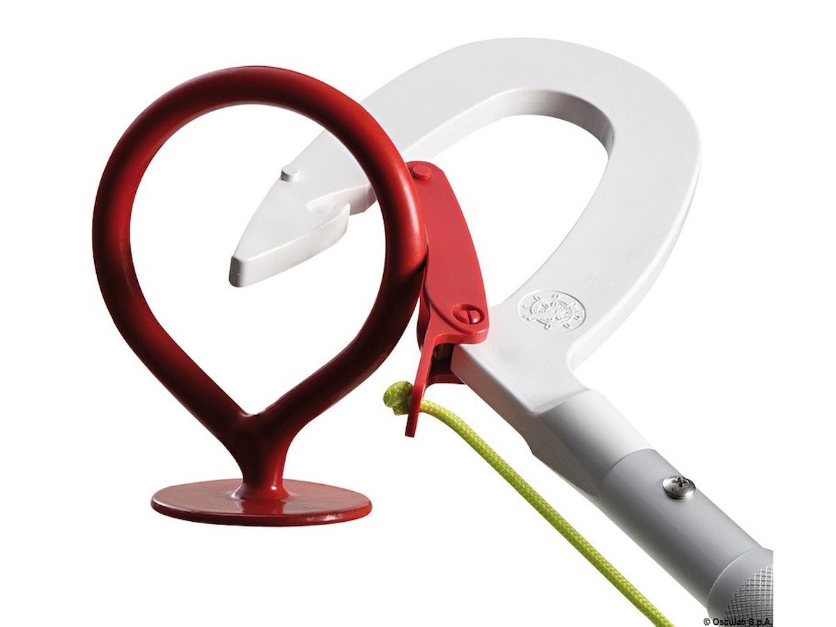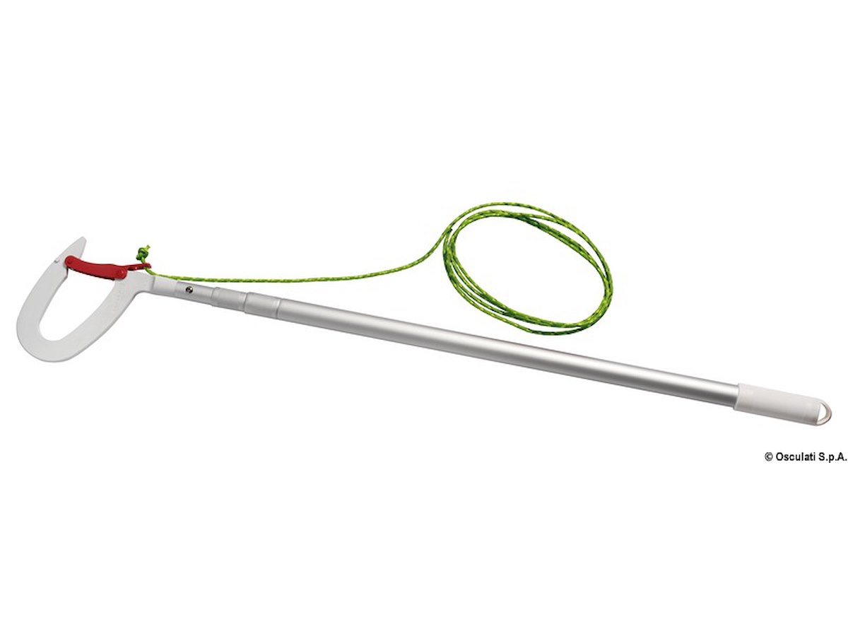 Oltre a funzionare come gancio d'accosto permette con un solo movimento di agganciare l'occhio del gavitello e recuperare a doppino la cima di ormeggio.