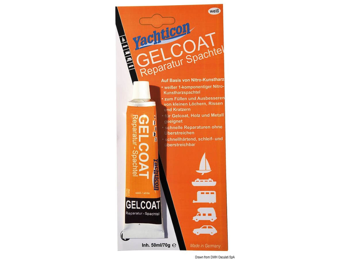 Gelcoat monocomponente nitrosintetico. Ideale per riparare piccoli danni sulla vetroresina / gelcoat / legno / metallo. Riparazione veloce senza necessità di verniciatura. Indurisce velocemente e, se necessario, può essere carteggiato e verniciato.