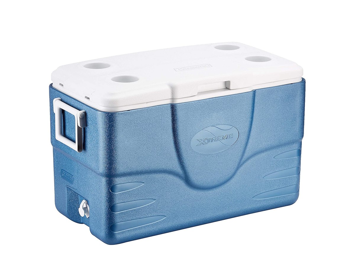 ghiacciaia serie Xtreme grazie all'isolamento in schiuma mantiene il ghiaccio fino a 5 giorni, maniglie scorrevoli salvaspazio e 4 portabicchieri integrati nel coperchio, cerniere in plastica e valvola di scarico