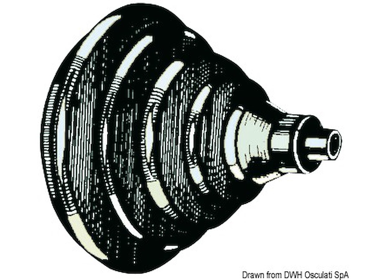 Completa di soffietto in gomma “Dutral” anti-salino a tenuta stagna per il passaggio di cavi per timoneria, tubi per benzina, cavi per telecomando.