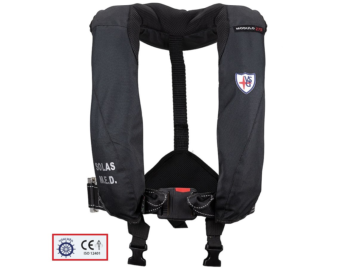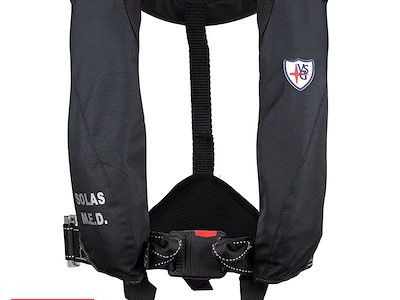 Giubbotto di salvataggio gonfiabile per adulti. Omologato e certificato SOLAS M.E.D., camera di galleggiamento a doppio comparto. Singolo Attivatore Automatico (SAA). Dotato di imbrago certificato ISO 12401, aggancio frontale per nastro di sicurezza. Munito di doppio sottogamba.