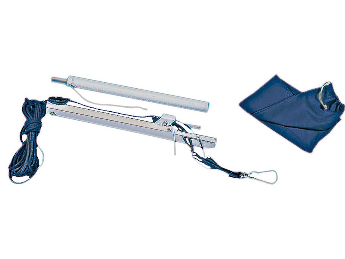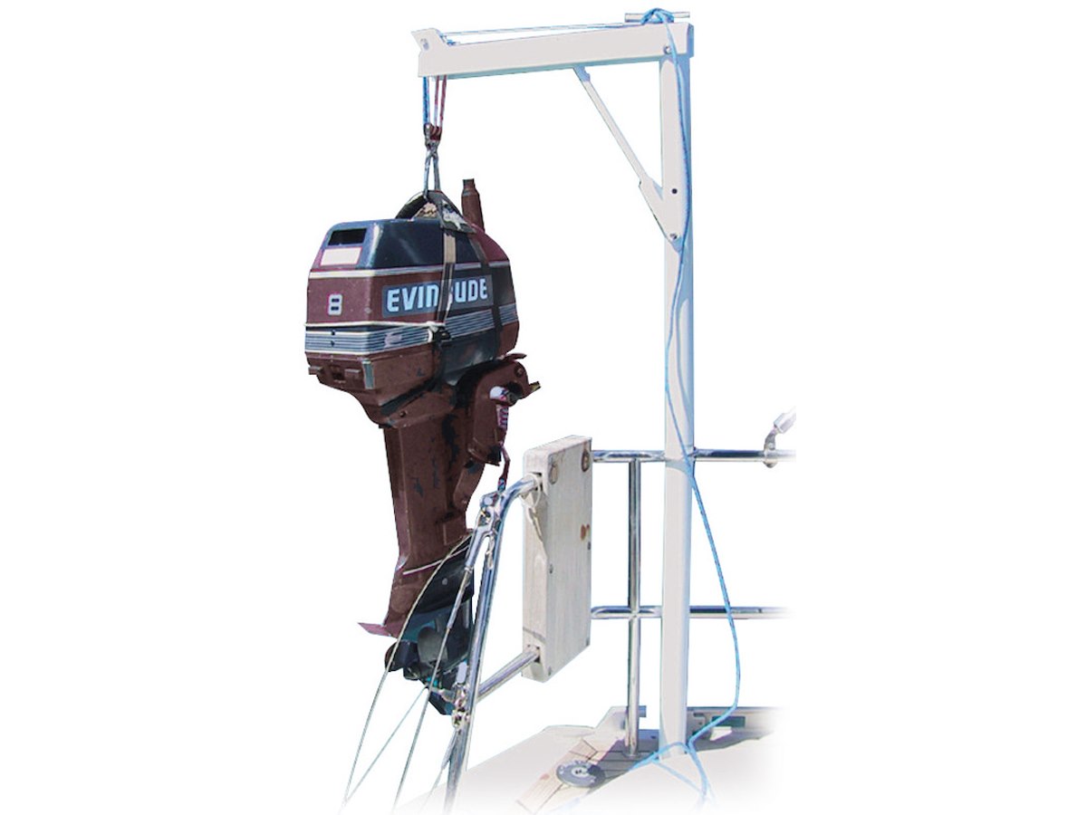 In alluminio, progettata per calare sul tender il motore fuoribordo. Si può togliere e mettere in pochi secondi essendo sfilabile dal supporto. Verniciata bianca con resine epossidiche, completa di paranco con bozzelli inox più moschettone inox, universale per qualsiasi imbarcazione, fornita di sacca.