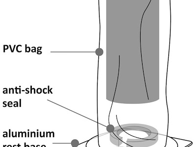 OPTIONAL 42.358.90: Sacco di drenaggio PVC con portagomma che permette di drenare eventuali infiltrazione d'acqua. Si fissa facilmente alla base gruetta grazie ad una fascetta metallica. Con base d'appoggio in alluminio anodizzato e guarnizione anti urto + sistema di drenaggio.