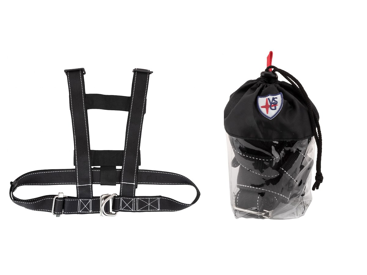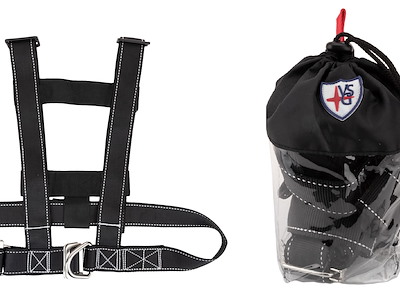 imbragatura di sicurezza certificata CE ISO12401, provvista di cinghie totalmente regolabili in vita con fibbie in acciaio inox e un robusto anello a ''D'' per attacco cintura di sicurezza, bande retroriflettenti e alamari di fissaggio per cerate