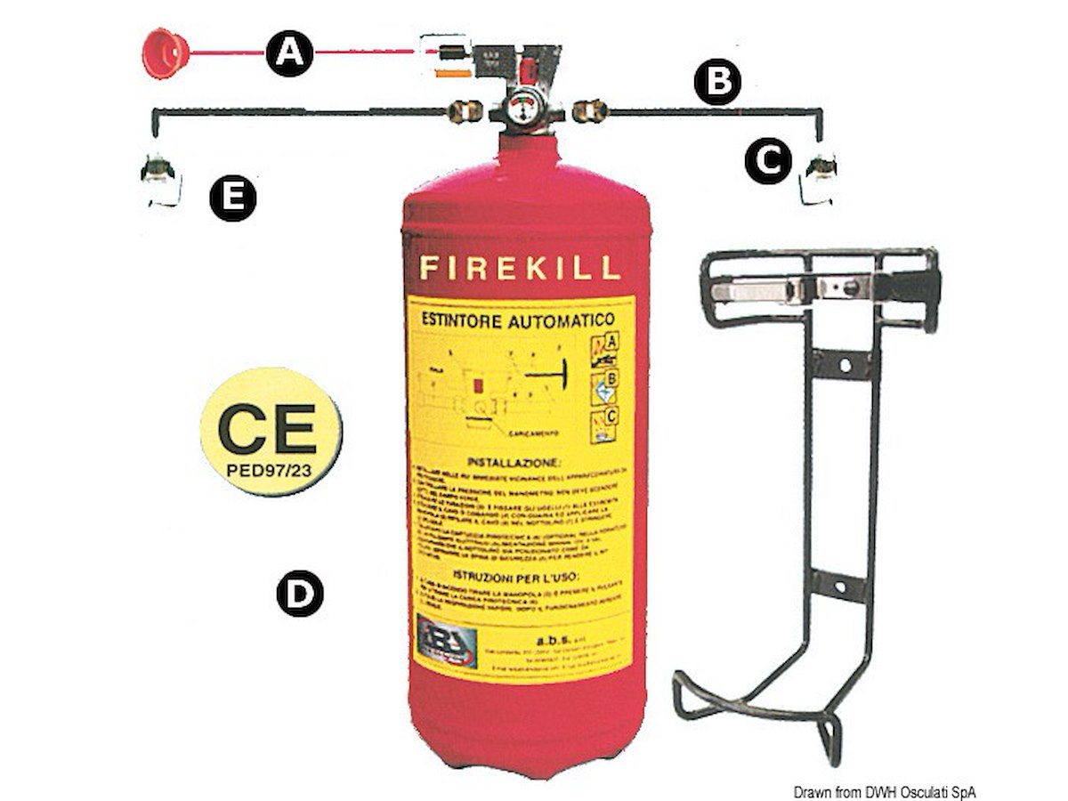 Omologati RINA ; modelli a polvere con azionamento automatico tramite rottura di un ampolla di vetro a 93°, oppure manualmente tramite flessibile con comando a distanza. Il kit é composto da: bombola caricata a polvere ABC 30%; valvola speciale con doppia uscita: per collegare più ugelli con più tubo di rame; maniglia di comando a distanza con cavetto in acciaio, lunghezza 6 m accorciabile; ugelli più tubo di rame da mm 8x10. Nuova versione 2017 che soddisfa ISO 9094 con pressostato da collegare ad una spia sul cruscotto (14.185.01/02 o simili) che segnala eventuali perdite di pressione o apertura impianto. A Comando a mano B Raccordo M10x C Ugello su serbatoio D Serbatoio verticale fissaggio a parete o pavimento E Ugello su vano motore