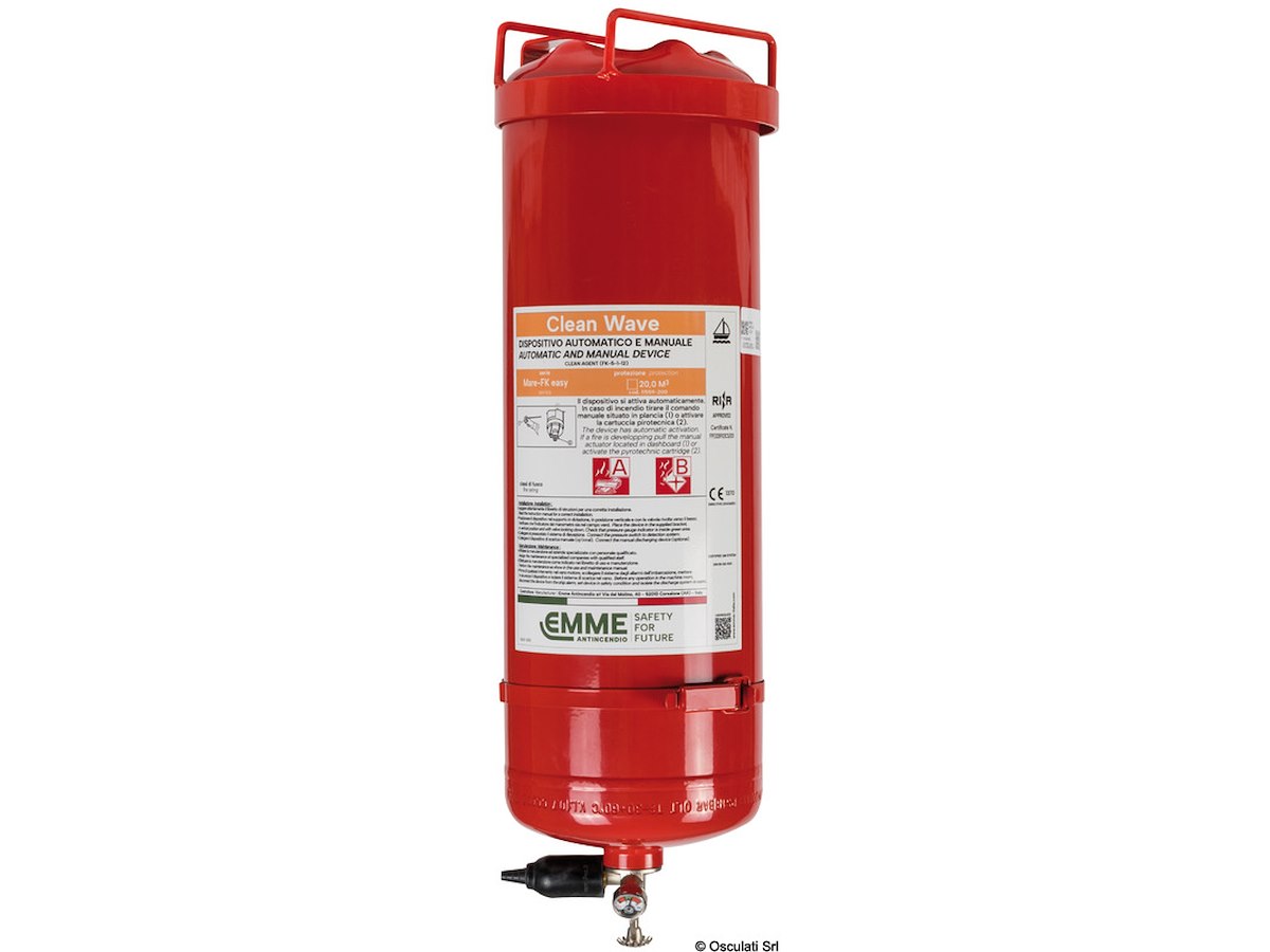 Omologati RINA, CE automatici a gas estinguente ecologico. Questo prodotto sostituisce l’Halon 1301 ed agisce a saturazione di ambiente. Rispetto alla polvere estinguente, non lascia alcun residuo per cui, anche in caso di apertura accidentale, non occorre ripristinare tutta la meccanica e accessoristica intasata dalla polvere estinguente. Il kit é composto da: bombola caricata a gas HFC-227 o FK-5-1-12 (ex NOVEC) + valvola speciale SPRINTVALVE ad attivazione termica a 93°+ cavetto con maniglia per comando a distanza, lunghezza 6 m accorciabile + staffa fissaggio estintore. Agendo per saturazione questo impianto non richiede tubazioni e ugelli supplementari. Per cubature maggiori, si possono usare più estintori.