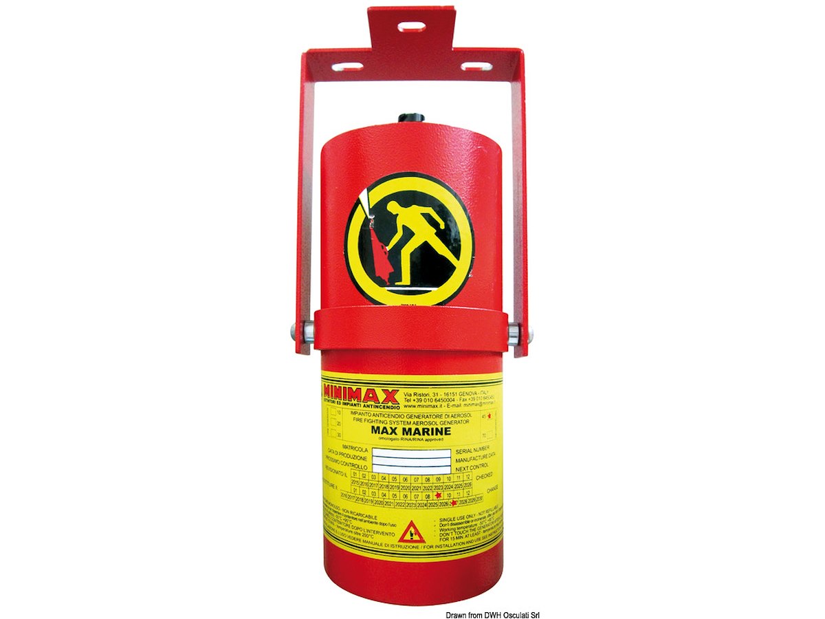 Max Marine è un sistema antincendio ad aerosol, certificato RINA, ogni generatore contiene l'agente estinguente solido che dopo l'attivazione si trasforma rapidamente in un aerosol con particelle di alcuni micron, le quali disperdendosi velocemente nell'ambiente presentano un comportamento simile a quello dei gas. L'aerosol generato estingue l'incendio inibendo la reazione chimica di combustione senza diminuire il contenuto di ossigeno nell'ambiente protetto, senza generare prodotti tossici o corrosivi e senza alcun danno allo strato di ozono atmosferico. È ecologico e rispetta l'ambiente. Il sistema ha un dispositivo di innesco a strappo o elettrico azionato a distanza e un dispositivo di intervento automatico (termocorda). Presenta innumerevoli vantaggi per le ridotte dimensioni , un peso molto contenuto , facilità di installazione per l'assenza di tubazioni di distribuzione, di ugelli di erogazione e di contenitori sotto pressione. L'attivazione e le logiche di intervento del Max Marine sono supervisionate da un pannello di controllo che dispone di contatti liberi per l'arresto utenze. Alimentazione centralina 24 V.