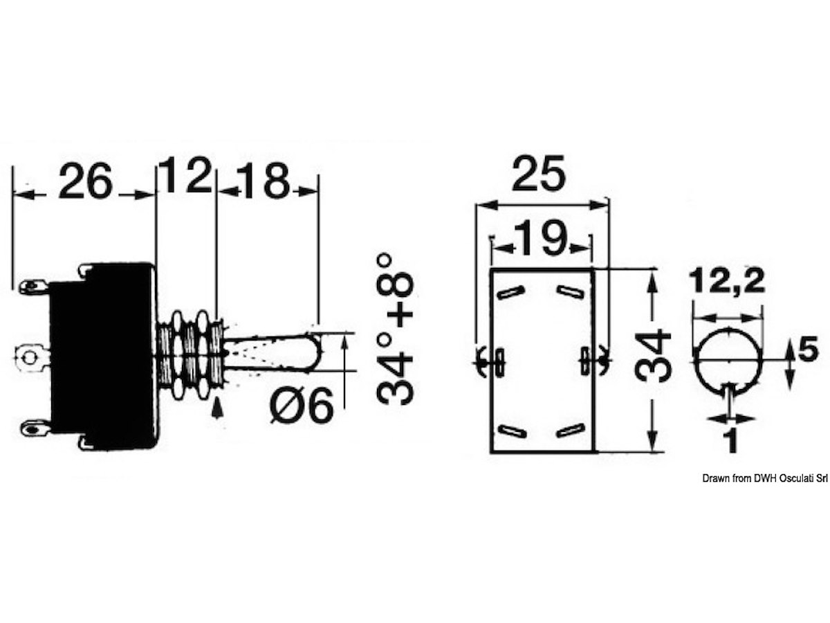 Carcassa in termoindurente resistente ad alta tensione, contatti in argento, leva di manovra e bussola in ottone nichelato. Capacità 15 A. Modello robustissimo e funzionale. Terminali “Faston”, perno 12x10 mm. Collegabili a due circuiti separati.