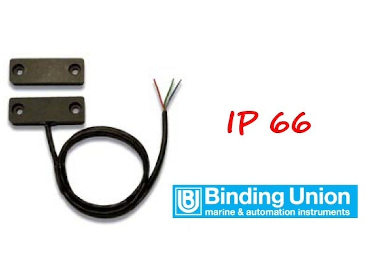 interruttore magnetico con contatto in scambio, costituito da un contatto REED e da un magnete permanente, permette di aprire o chiudere un contatto all'avvicinarsi del magnete, grado di protezione IP66, distanza massima d'attivazione 20mm