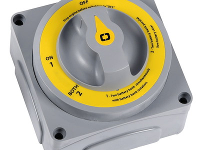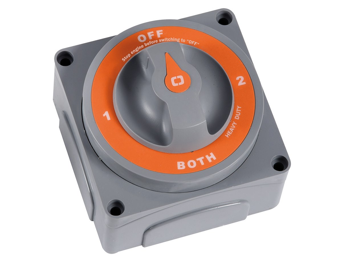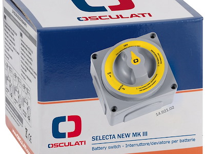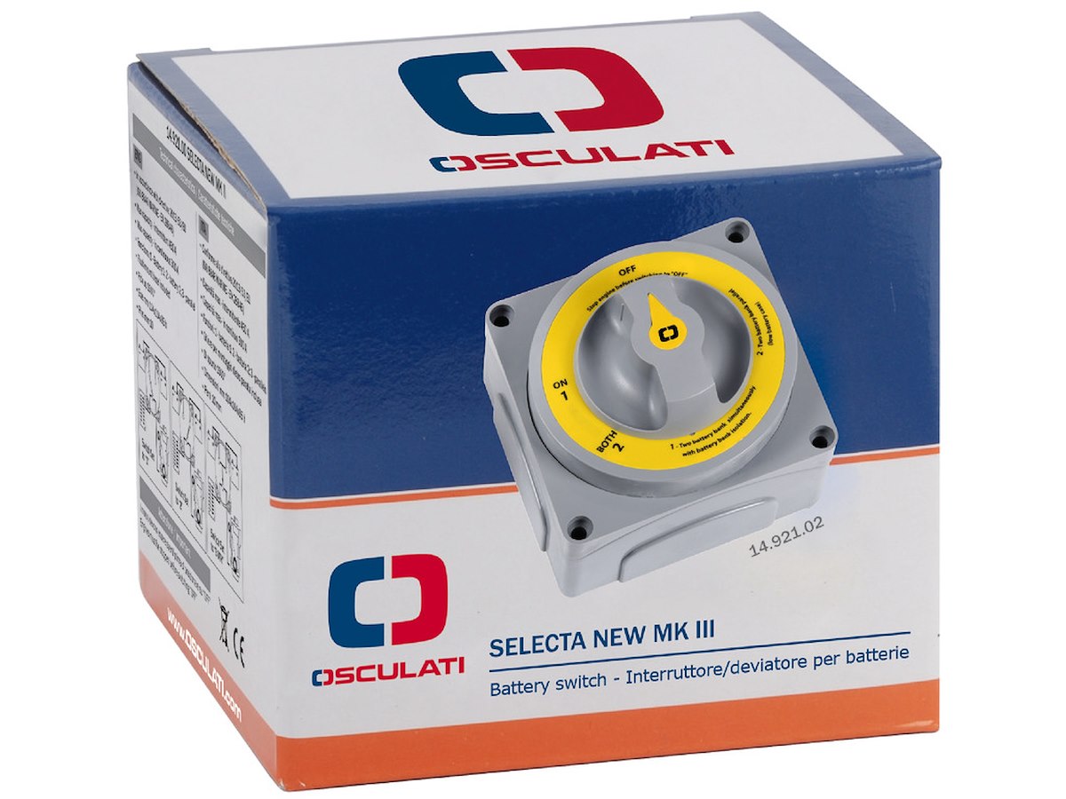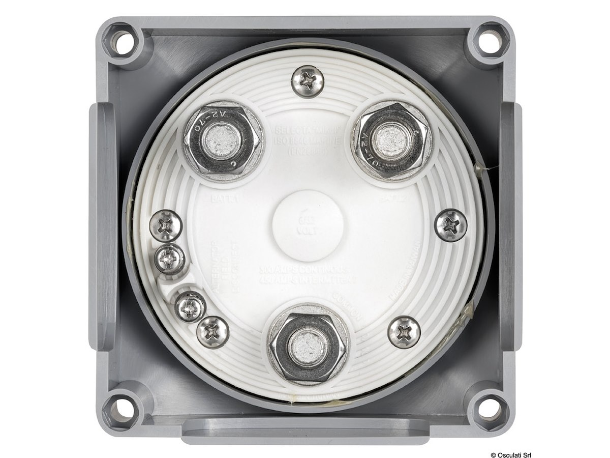 Permette di usare separatamente o assieme le batterie. Contatti in rame, molle inox, carcassa in PC / PTB / Fiberglass, resistente alla fiamma. Fondello di protezione per i cavi. Ghiera supplementare per montaggio ad incasso (foro Ø mm 95). Specifiche: UNI EN ISO 8846. A) Versione MK II. Opzioni selezionabili: banco/batteria "1", banco/batteria "2" oppure bancate 1+2 simultaneamente. Completo di dispositivo che disconnette automaticamente l'alternatore se viene attivata la funzione "OFF" senza aver spento i motori. Numero di omologazione: DIP006907SP. B) Versione "MK III". Collega contemporaneamente in posizione "1" le batterie avviamento con i motori e le batterie servizi con gli stessi, mantenendo le batterie avviamento separate, minimizzando i rischi di scarica accidentale delle stesse. In caso d'emergenza. In posizione "2" i due circuiti vengono collegati tra loro (in parallelo). Numero di omologazione: DIP006907SP.