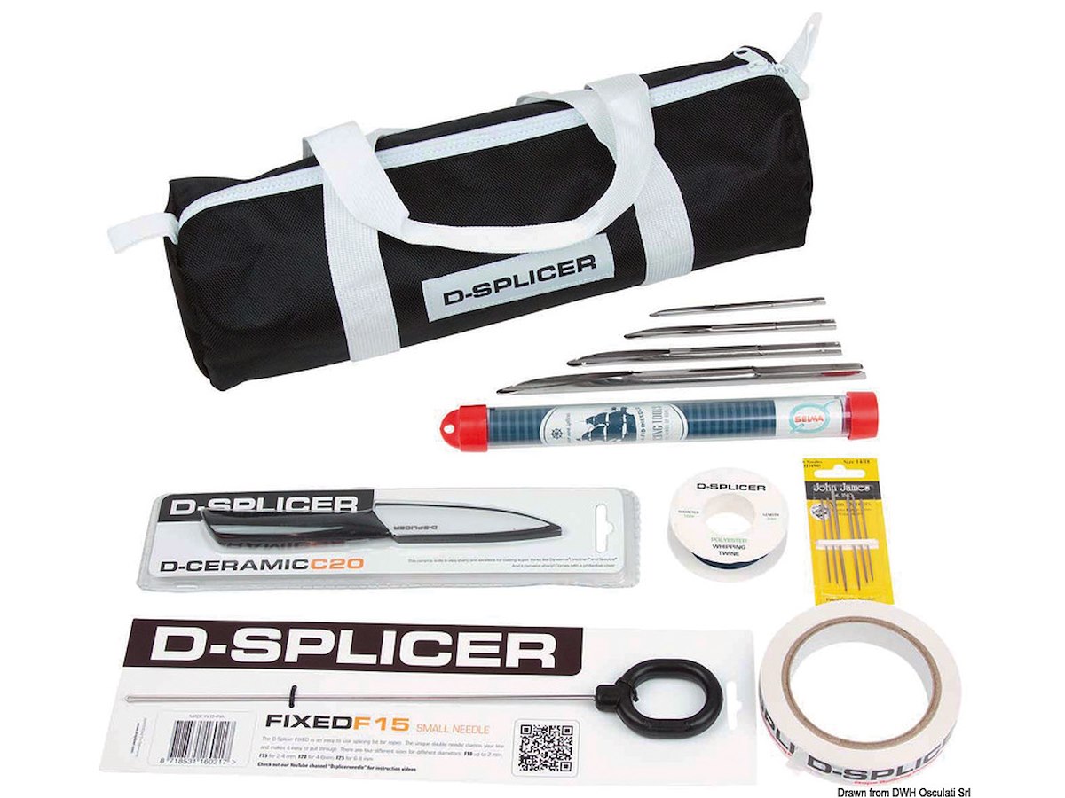 Descrizione: Kit per impiombare cime composto da: un ago F15, un coltello in ceramica D-24, un nastro adesivo da 66 m, kit aghi per cucire, bobina di filo cerato, guardapalmo, caviglia, set 4 feeder.