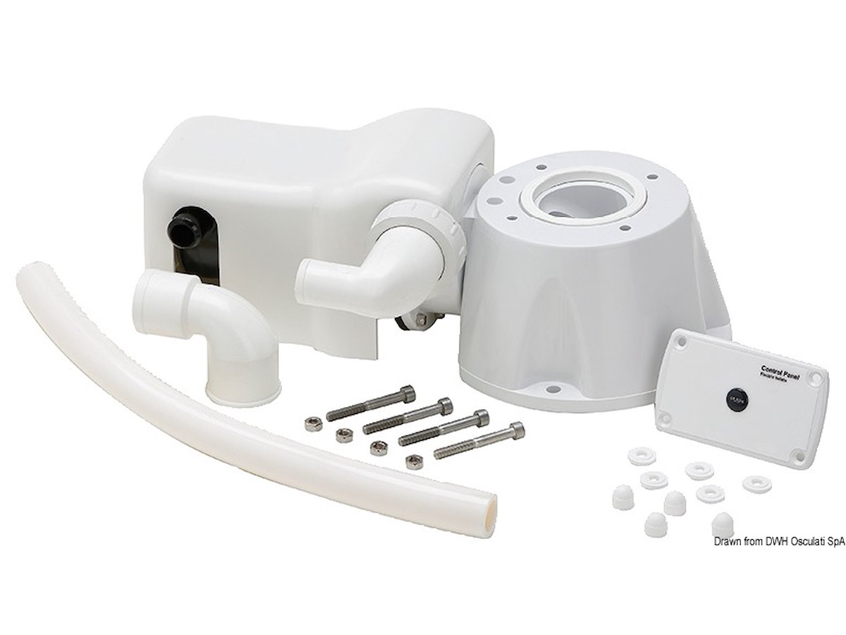 Per WC a mano tipo 50.206.25; 50.207.25/27; 50.217.25/30; 50.207.50. Il kit comprende il basamento, la pompa ed il motore elettrico. Adattabile ai WC: JABSCO, SPX, RARITAN, GROCO.