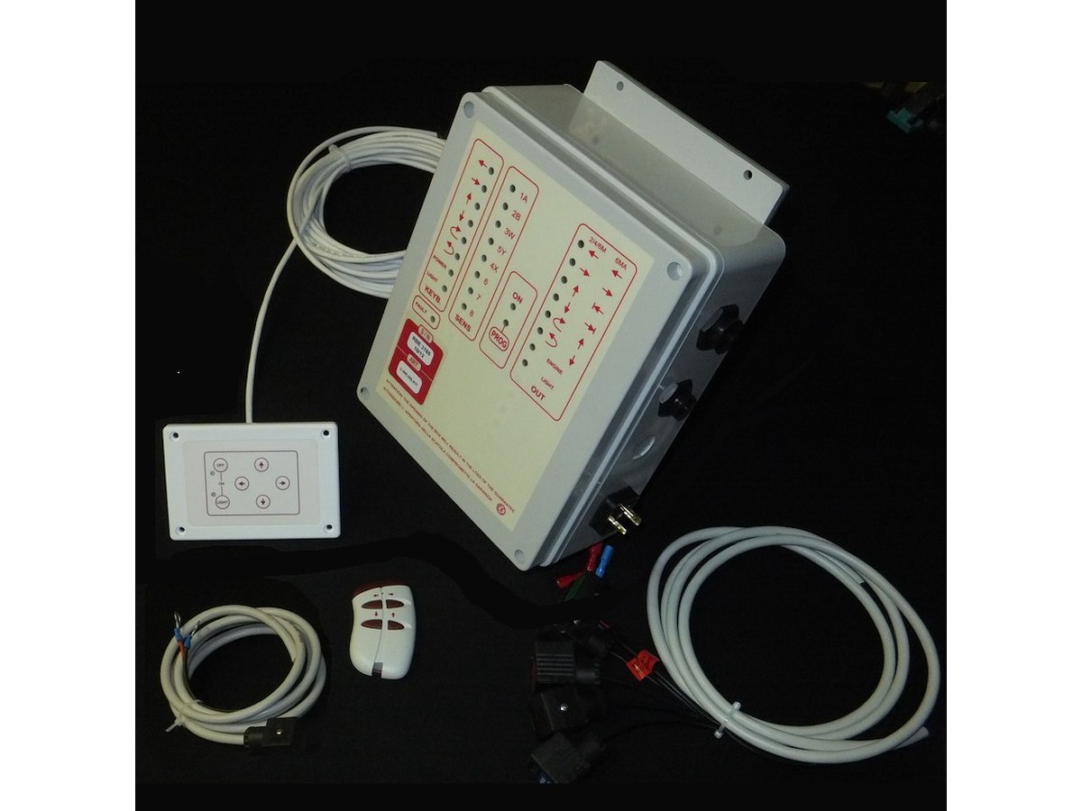 kit gestione passerelle idrauliche in contenitore stagno con connettori IP68 per semplificare e ridurre le tempistiche di installazione e assistenza, alta sicurezza grazie alla gestione con doppio processore rindondante, radiocomando non clonabile con programmazione semplificata dal cruscotto frontale della centrale, kit completo di box elettronica con connettori stagni, tastiera con 10mt di cavo, radiocomando rolling code, cablaggio elettrovalvole e alimentazione