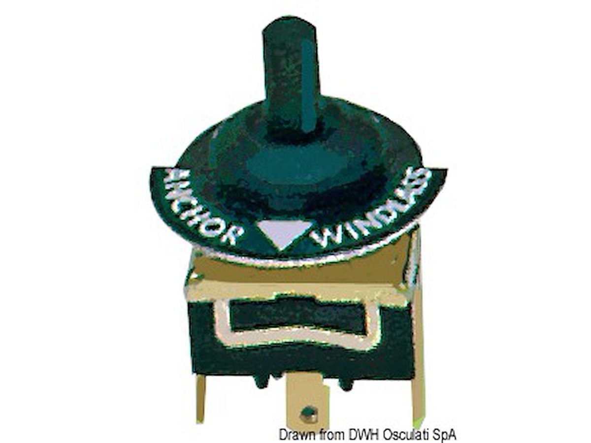 Composto da interruttore ON-OFF-ON a molla + cappuccio stagno in gomma + piastrina circolare “Windlass Control Up-Down”. Non comanda direttamente il verricello, ma va collegato ad un teleruttore.