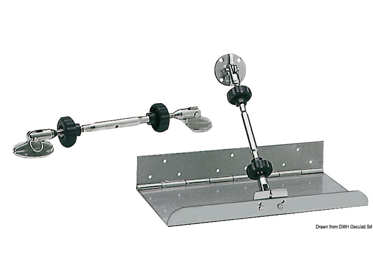 E’ costituito da due tenditori in acciaio inox da 10 mm, più quattro piastre in acciaio inox per il fissaggio dei tenditori ai flap e allo scafo, più due volantini speciali per il bloccaggio e lo sbloccaggio rapido a mano dei tenditori.