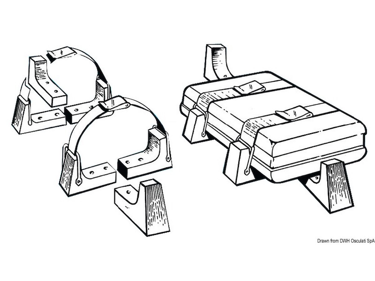 Fissaggio in coperta o paratia; kit completo di supporti, fasce in poliestere pesante, ganci e fibbie in acciaio inox per lo sganciamento rapido. Modello universale per le nostre zattere.