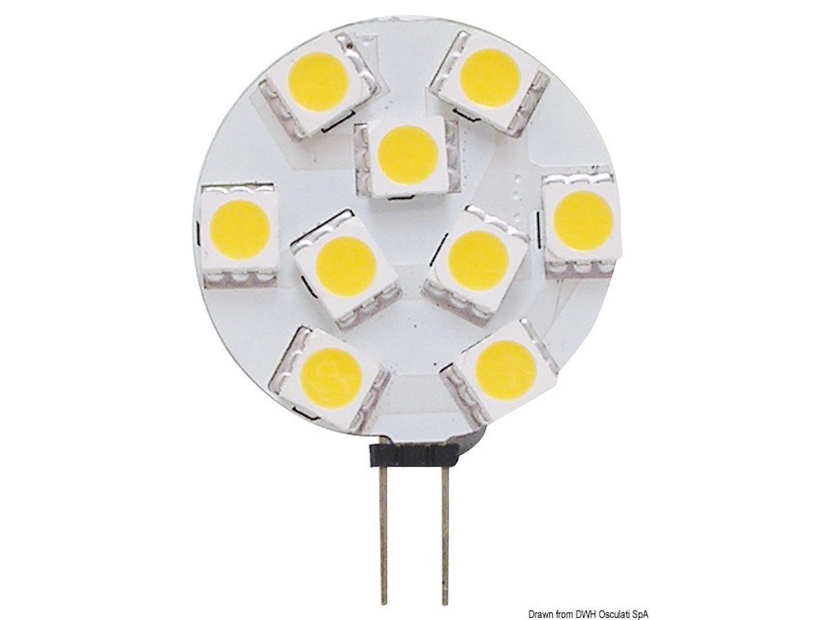 Zoccolo: G4 Ø chip mm: 28 V: 12/24 W: 1.6 W equivalenti: 11 Lumen: 160 K: 2700 Angolo LED: 120° N. LED: 9 Attacco: Laterale