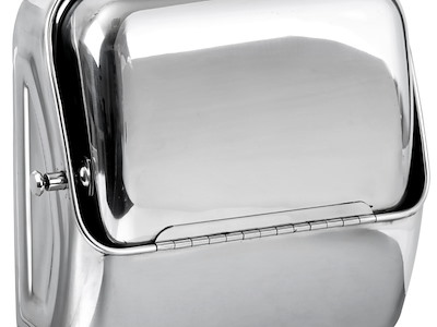 Lavello ribaltabile a muro in acciaio inox, con rubinetto incorporato. Fornito completo di portasapone.