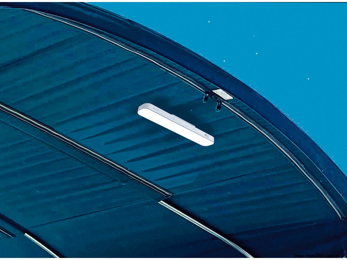 L’innovativo sistema a serraggio magnetico permette di poter applicare il punto luce in qualsiasi posizione del tendalino. La clip di dimensioni ridotte può rimanere installata sul bimini anche con il tendalino chiuso.