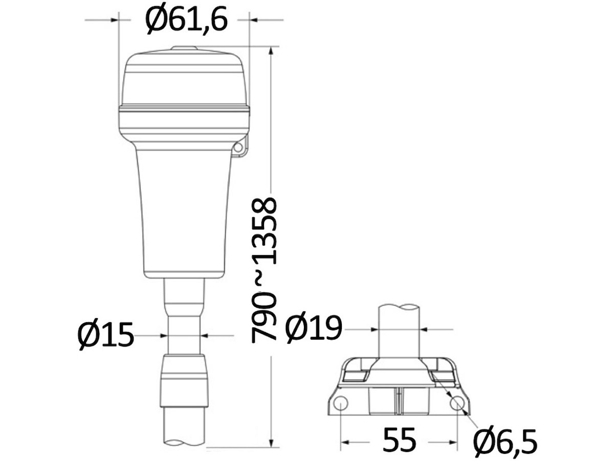 Montate su tubo telescopico 790/1358 mm. Alimentazione interna con 3 pile AA, autonomia fino a 24 ore. Stagne IP67. Certificate CE. Fissaggio a baionetta Clik/clak sulla base.