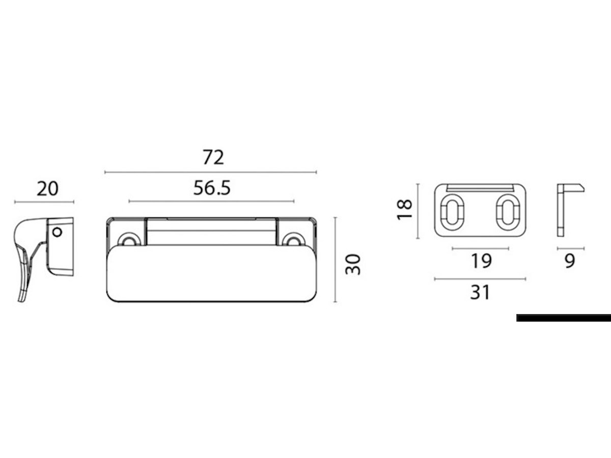 Rimane nascosta sotto la battuta dell'antina. In ottone cromato. misure mm: 72x30x20