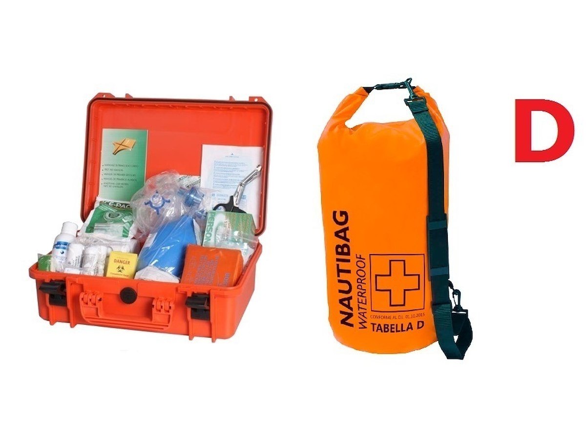 Kit di primo soccorso nautico secondo normativa D.L. 10/03/2022 tabella D (escluse le specialità medicinali) disponibile sia nella robusta valigia certificata IP67 che nella sacca a tenuta stagna.