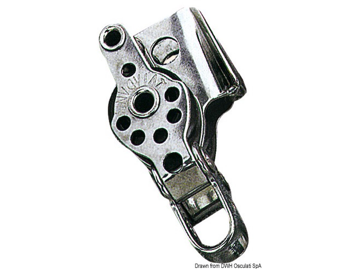 Versione: Doppio con arricavo e strozzascotte Puleggia Ø mm: 17 Per cime fino a mm: 5 Carico di rottura kg: 300