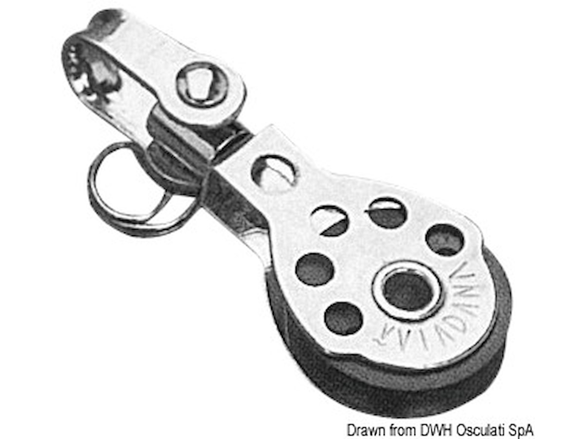Versione: Girevole con grillo Puleggia Ø mm: 25 Per cime fino a mm: 6 Carico di rottura kg: 350