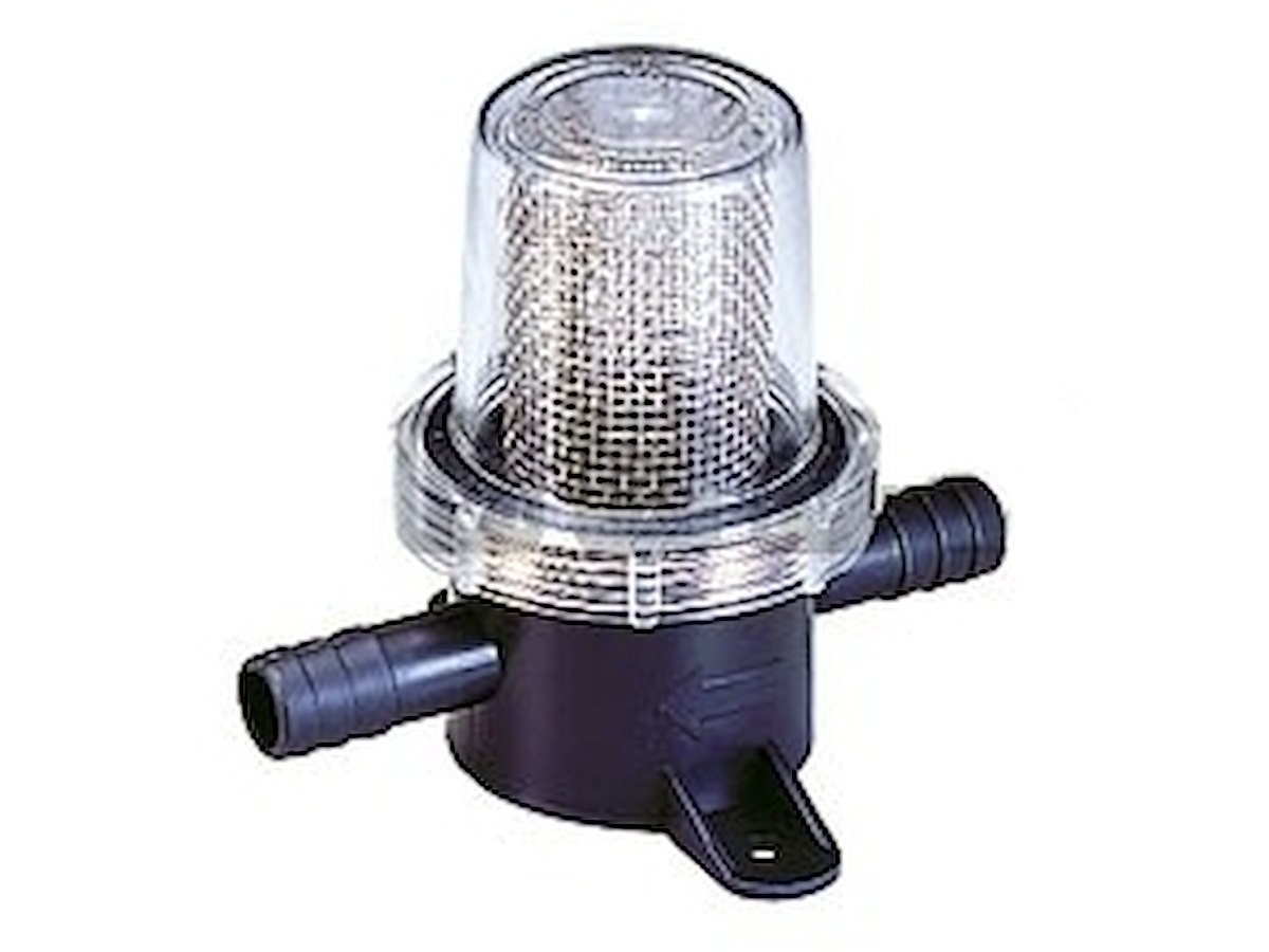 filtro in linea in materiale plastico con filtrante in rete in acciaio inox, entrata e uscita con portagomma, dimensioni Ø60mm H90 mm