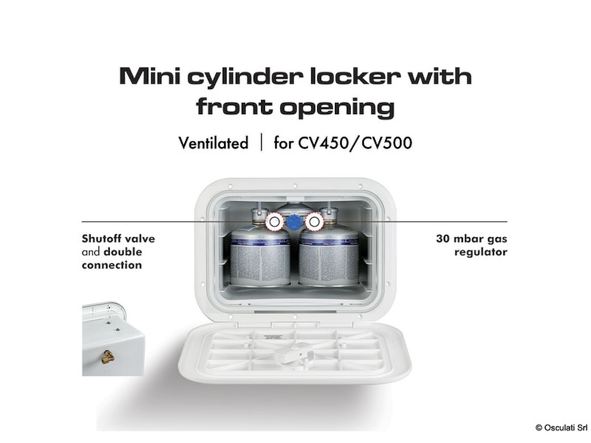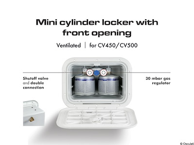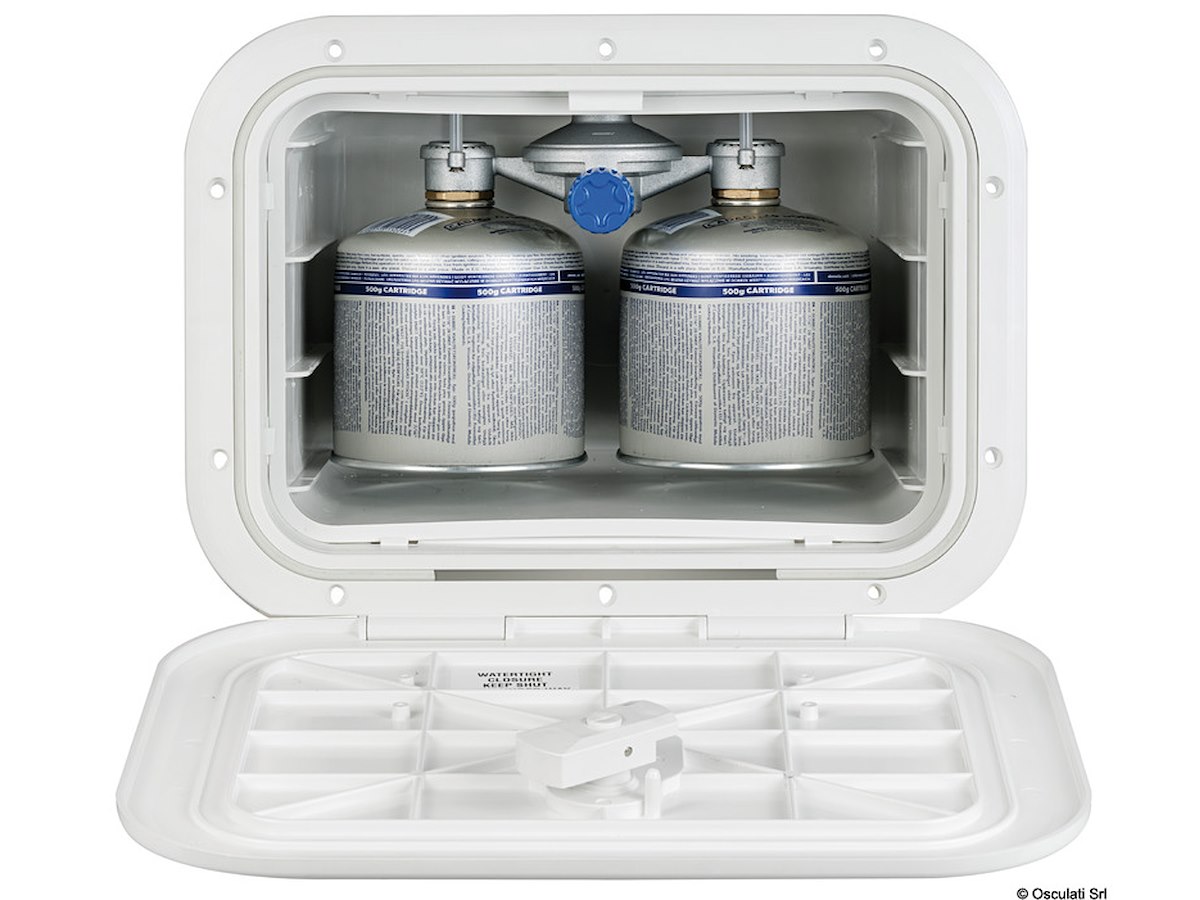 Il gavone è dotato di un regolatore gas da 30 mbar, rubinetto di chiusura flusso e doppio attacco per alloggiare due bombole con valvola avvitabile (EN417) max 500 gr.