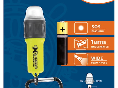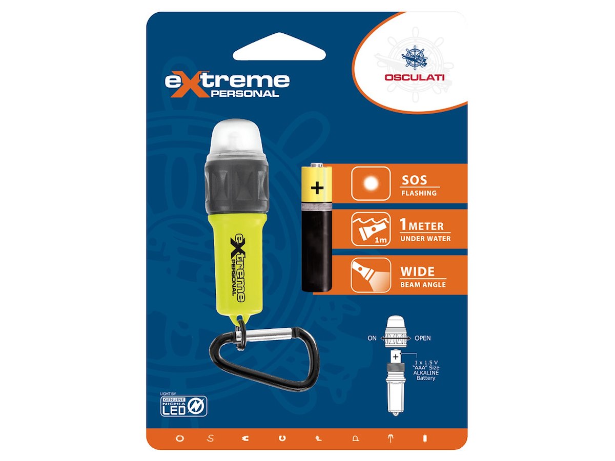 Si può collegare al giubbotto di salvataggio tramite il moschettone o usare come una piccola torcia. Funzioni: luce fissa o flash. Sommergibile fino a 1 m. Accensione a rotazione ghiera.