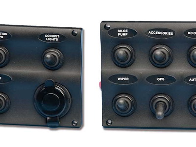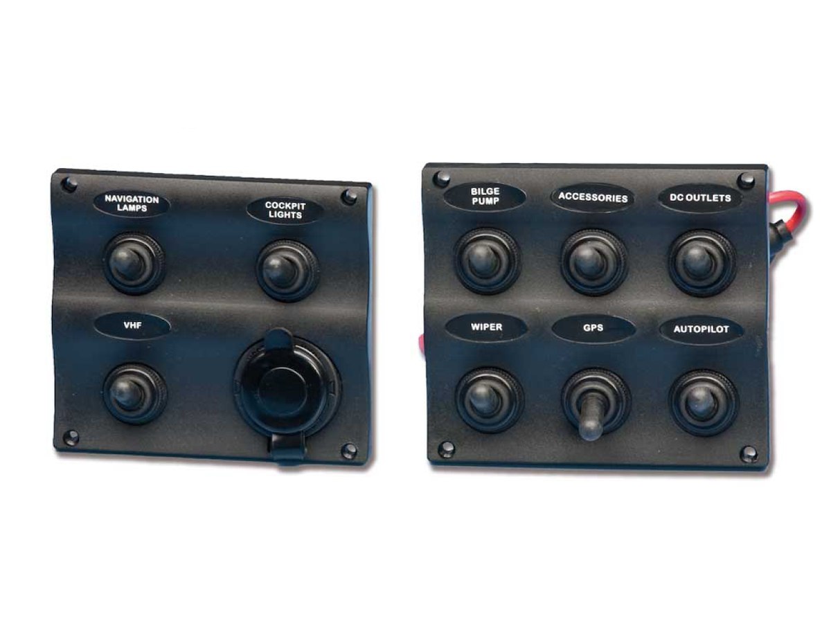 pannello elettrico ad interruttori stagni con cappucci in gomma, completo di portafusibili e fusibili da 15A, dimensioni esterne 108x96mm