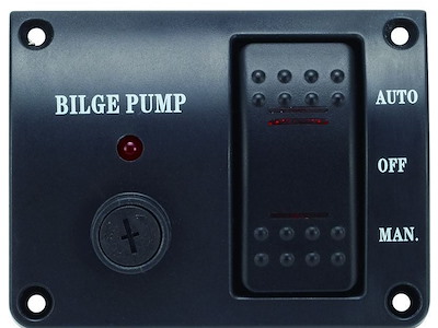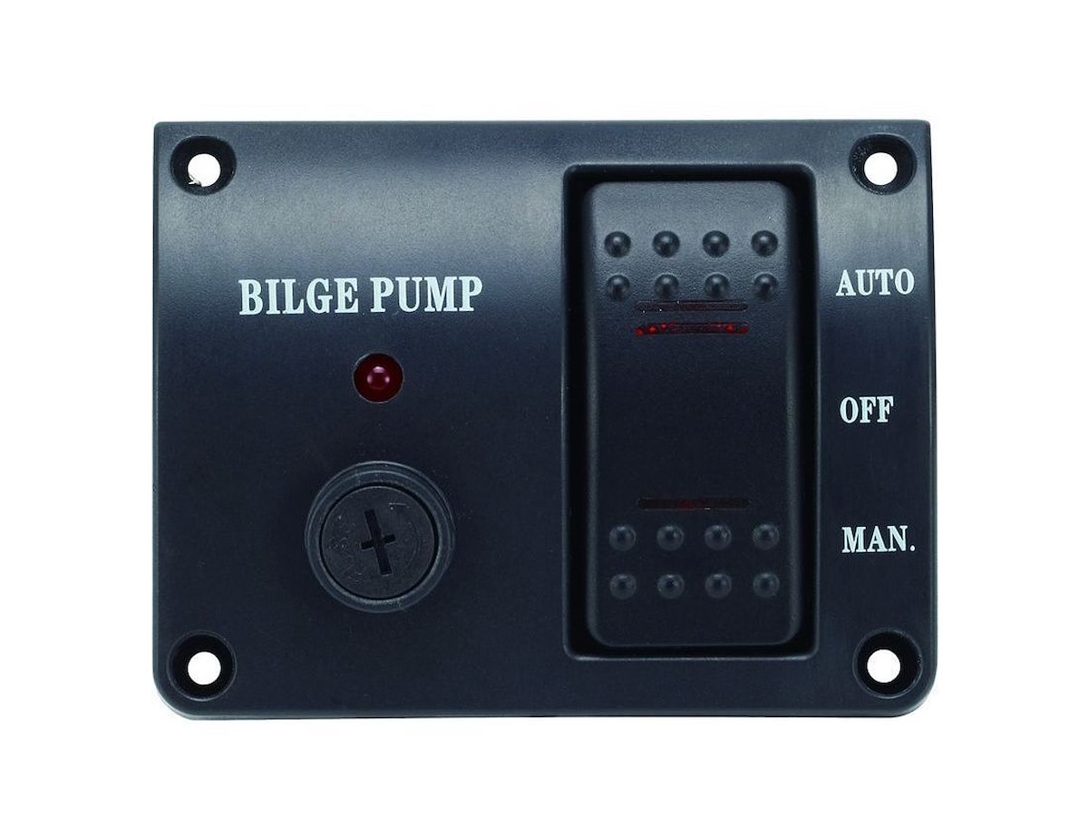 pannello di comando per pompa di sentina universale con fusibile, LEd e interruttore a bascula con 3 posizioni e ritorno a molla da posizione manuale per non rischiare di lasciare la pompa accesa