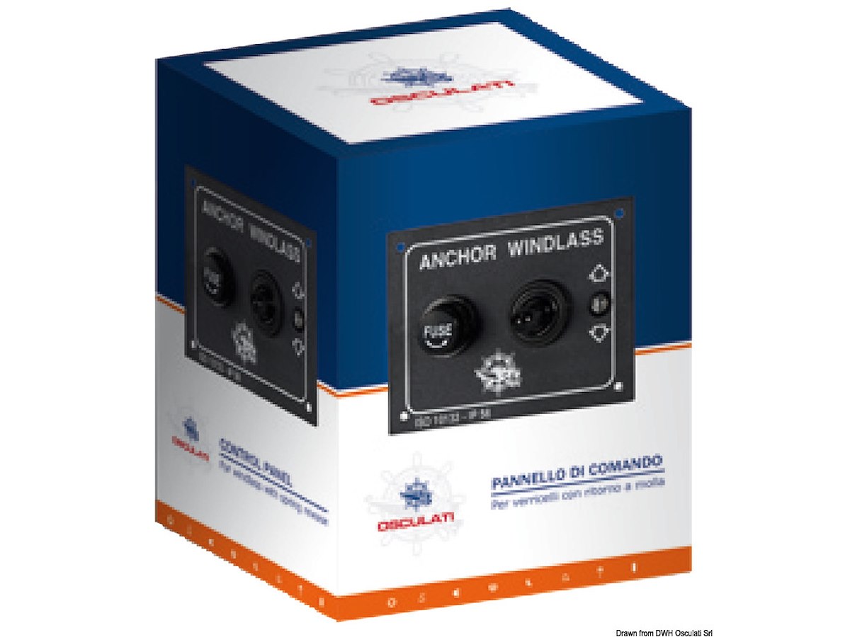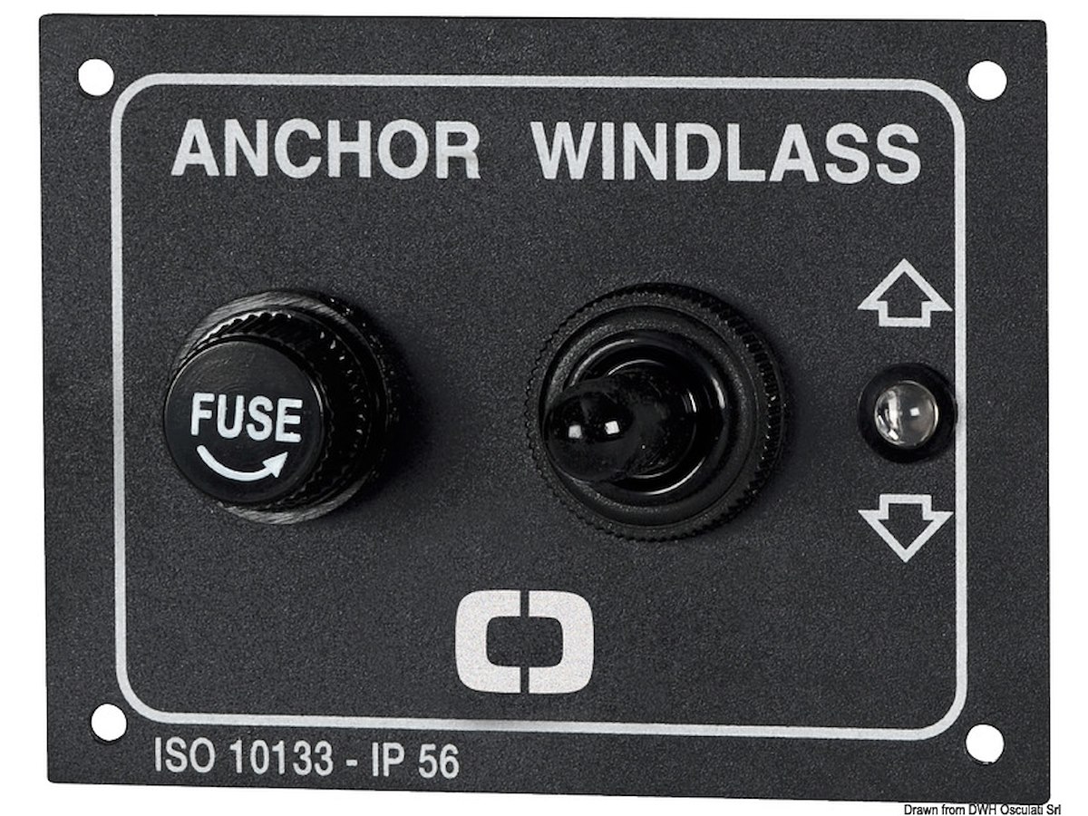 Comprende un interruttore ricoperto di gomma a tenuta stagna “Up Down” con ritorno a molla, un portafusibile di sicurezza, due spie luminose a LED di controllo.
