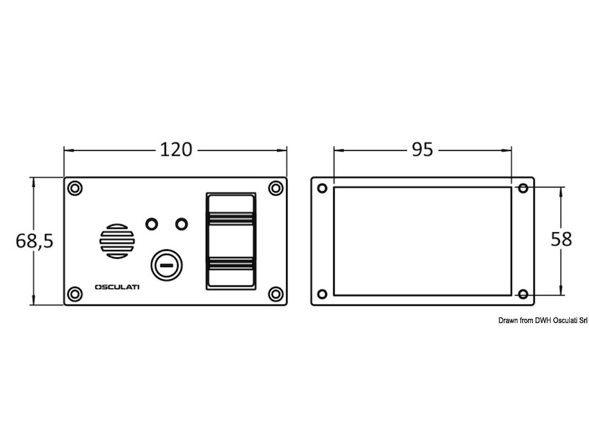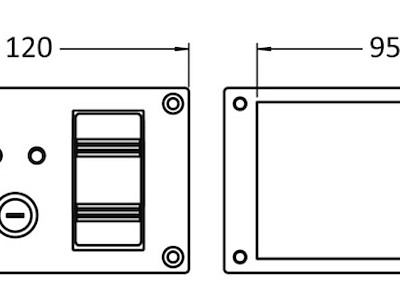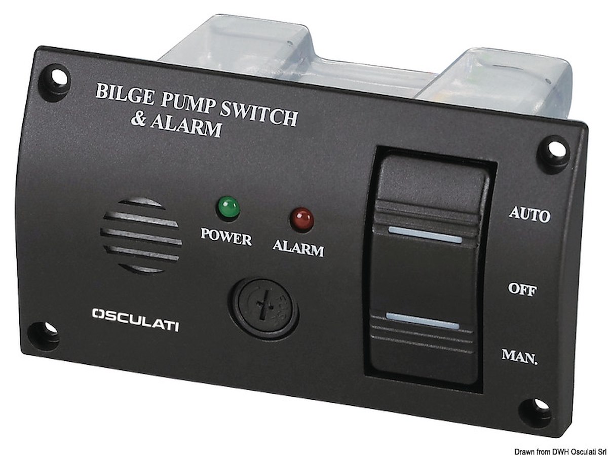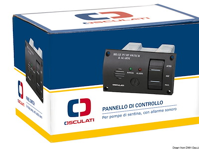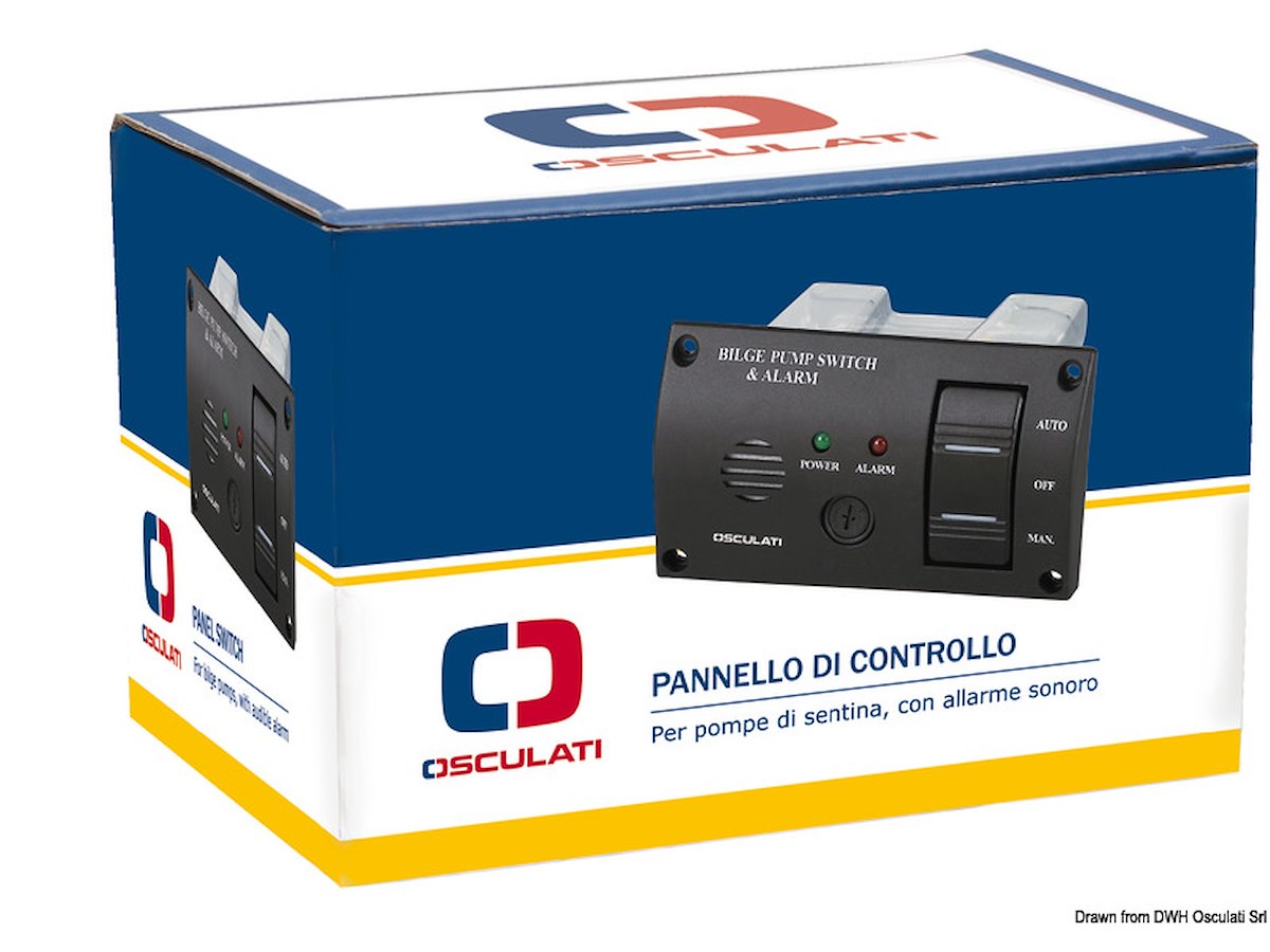 IP43. Modello con copertura posteriore. Completo di: - interruttore ON-OFF-M.ON per azionare la pompa in automatico oppure in manuale, con LED di controllo; - allarme luminoso e sonoro 80 db per segnalazione acqua in sentina; - fusibile max 5A.
