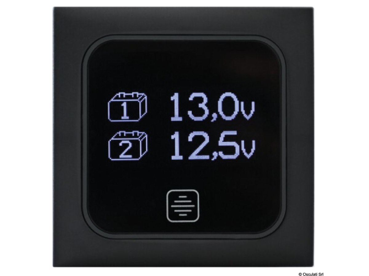 Pannello digitale touchscreen per il controllo di 2 batterie a 12 V. Cornice: COLORE_grigio_pieno Grigio scuro misure mm: 60 x 60