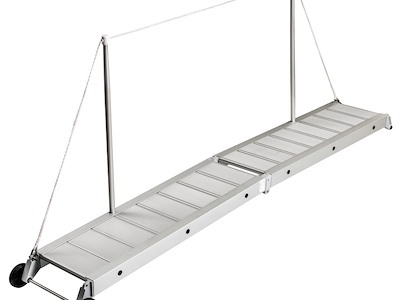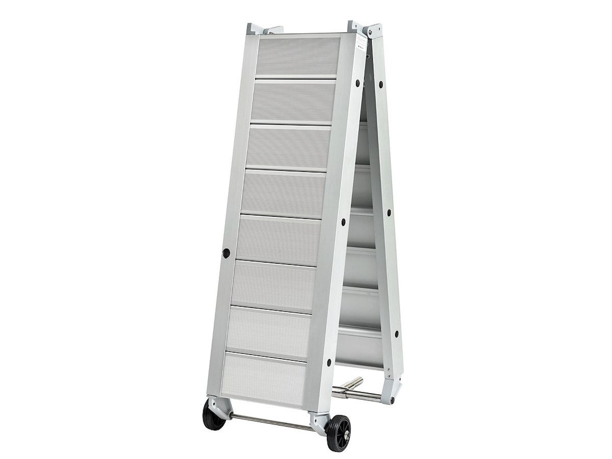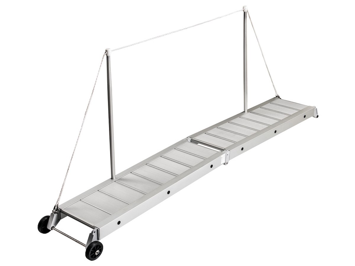 Prodotto di elevata qualità, con piano in alluminio rivestito da bande antisdrucciolevoli. Completa di candelieri e corrimano in cima.