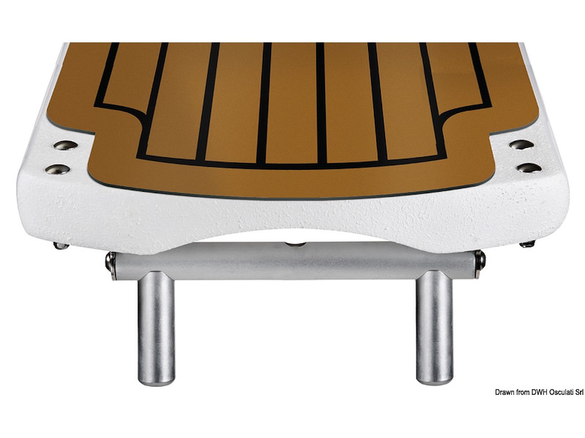 Struttura realizzata in carbonio a più strati e con profili d'alluminio di supporto. Cerniere in alluminio anodizzato. Ruote con carcassa inox, con anelli che permettono il sollevamento della passerella. Provvista di doppio perno pivotante. Si può montare con un solo perno e la passerella può brandeggiare, oppure con due perni che consentono il solo movimento verticale (entrambi i perni sono inclusi). Disponibile in diverse configurazioni di piano di calpestio:superficie anti-scivolo bianca, EVA marrone ed EVA grigio.