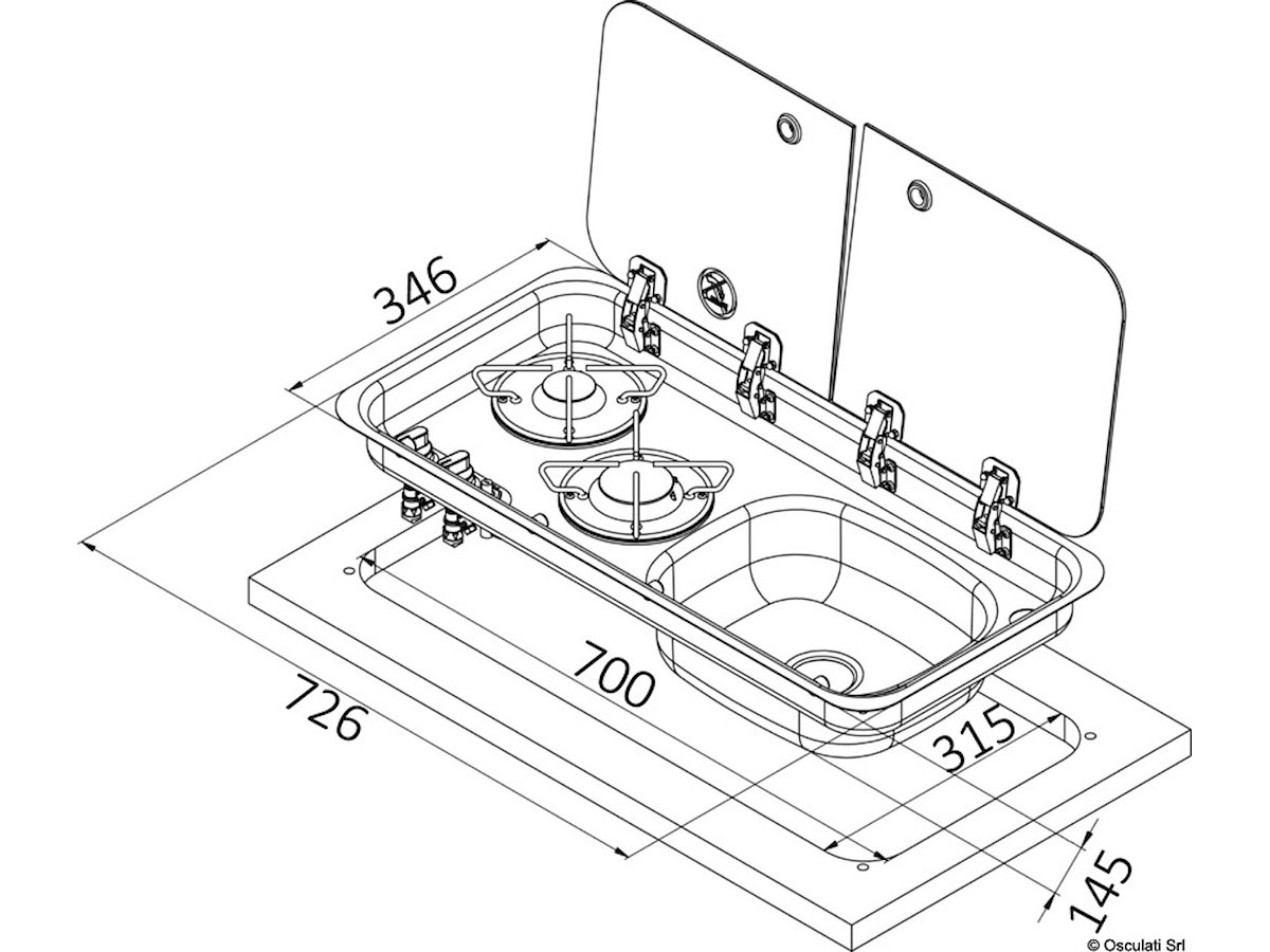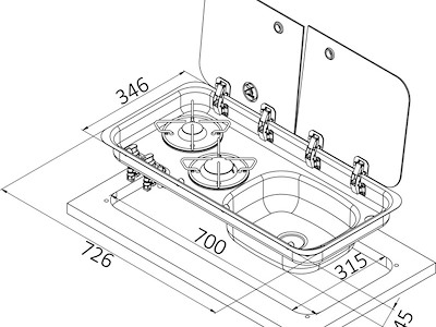 Con vasca: DX N° fuochi: 2 misure mm - esterno: 726x346 misure mm - interno: 688x319 misure mm - profondità incasso: 140 Bruciatori W: 1800+1000 Fermapentole OPTIONAL: [50.100.92]