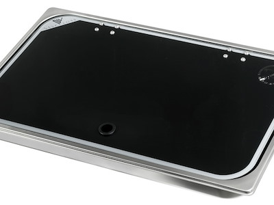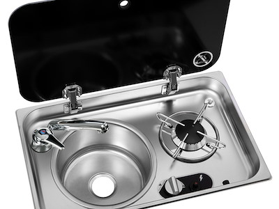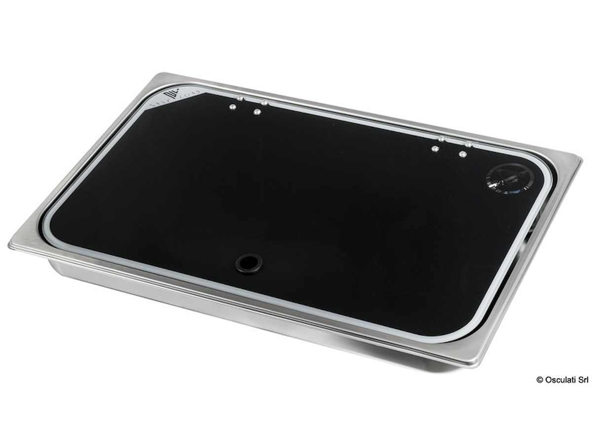Piani cottura in acciaio inox con coperchio in vetro temperato fumé, completo di rubinetto miscelatore acqua calda e fredda.
