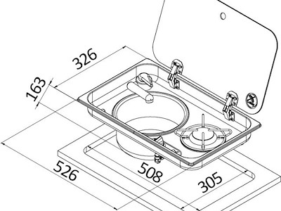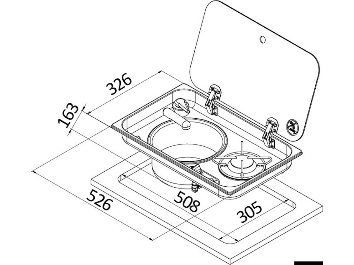 Con vasca: DX N° fuochi: 1 misure mm - esterno: 526x326 misure mm - interno: 515x325 misure mm - profondità incasso: 163 Bruciatori W: 1800 Fermapentole OPTIONAL: [50.100.91]