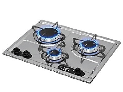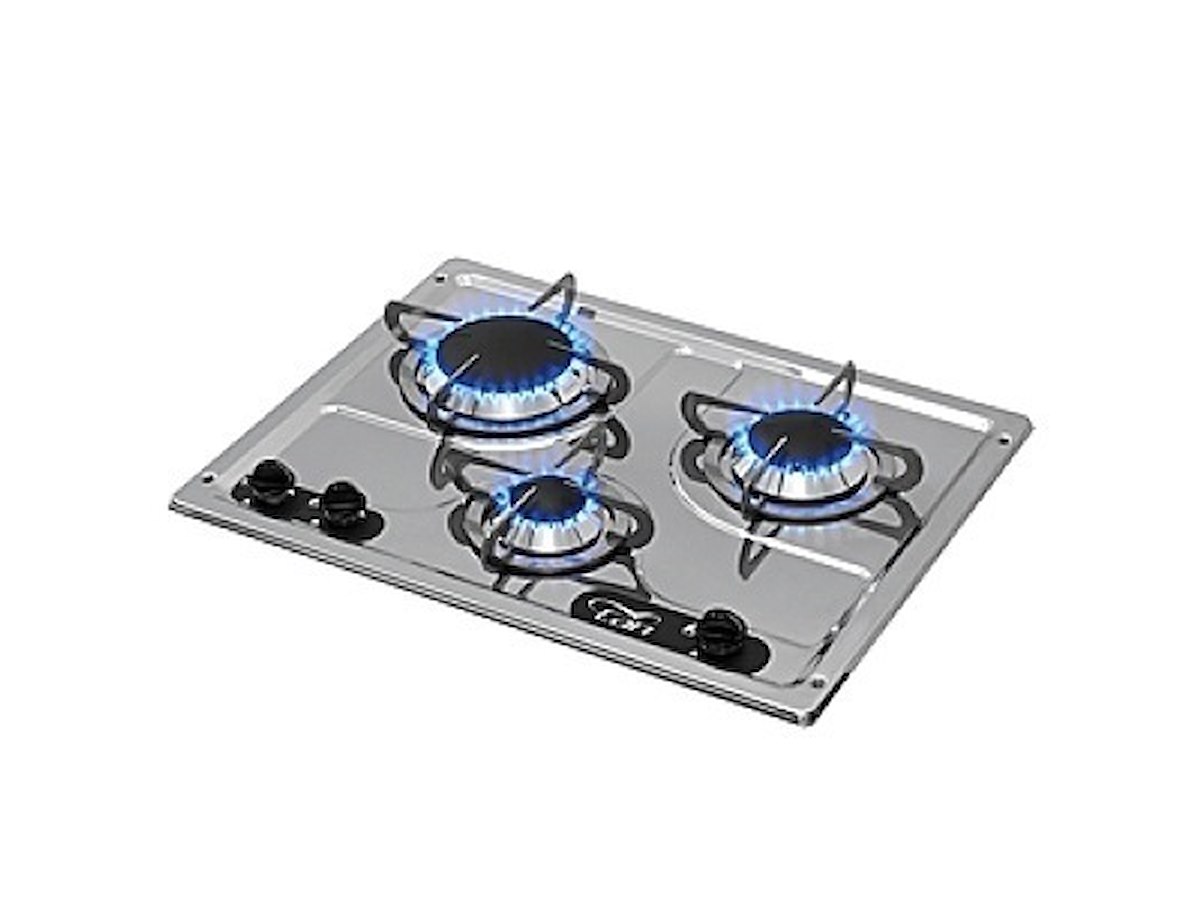 piano di cottura ad incasso realizzato in acciaio inox lucidato a specchio, i bruciatori sono forniti di valvola di sicurezza, dim. piano 470x360mm, altezza (est+int) 30+100mm, 1 bruciatore 3000W, 1x1750W, 1x1000W