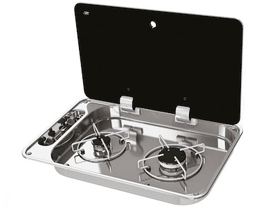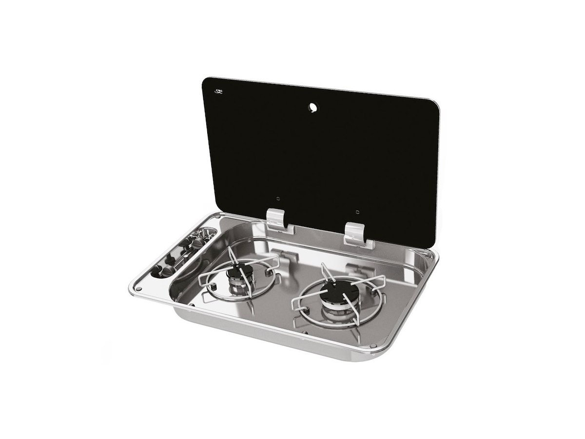 modello a 2 fuochi a incasso in acciaio inox con coperchio in vetro fumè, accensione piezo
