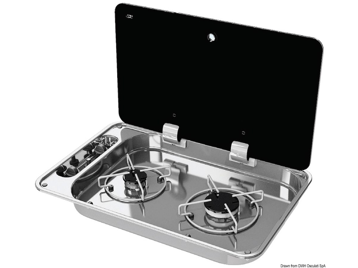 Con coperchio in vetro nero fumè, temperato, autobloccante. Cerniere a scomparsa. Griglia di supporto in inox con gommini antivibrazione. Bruciatori ad alta efficienza. Accensione manuale. Omologazione CE.