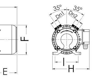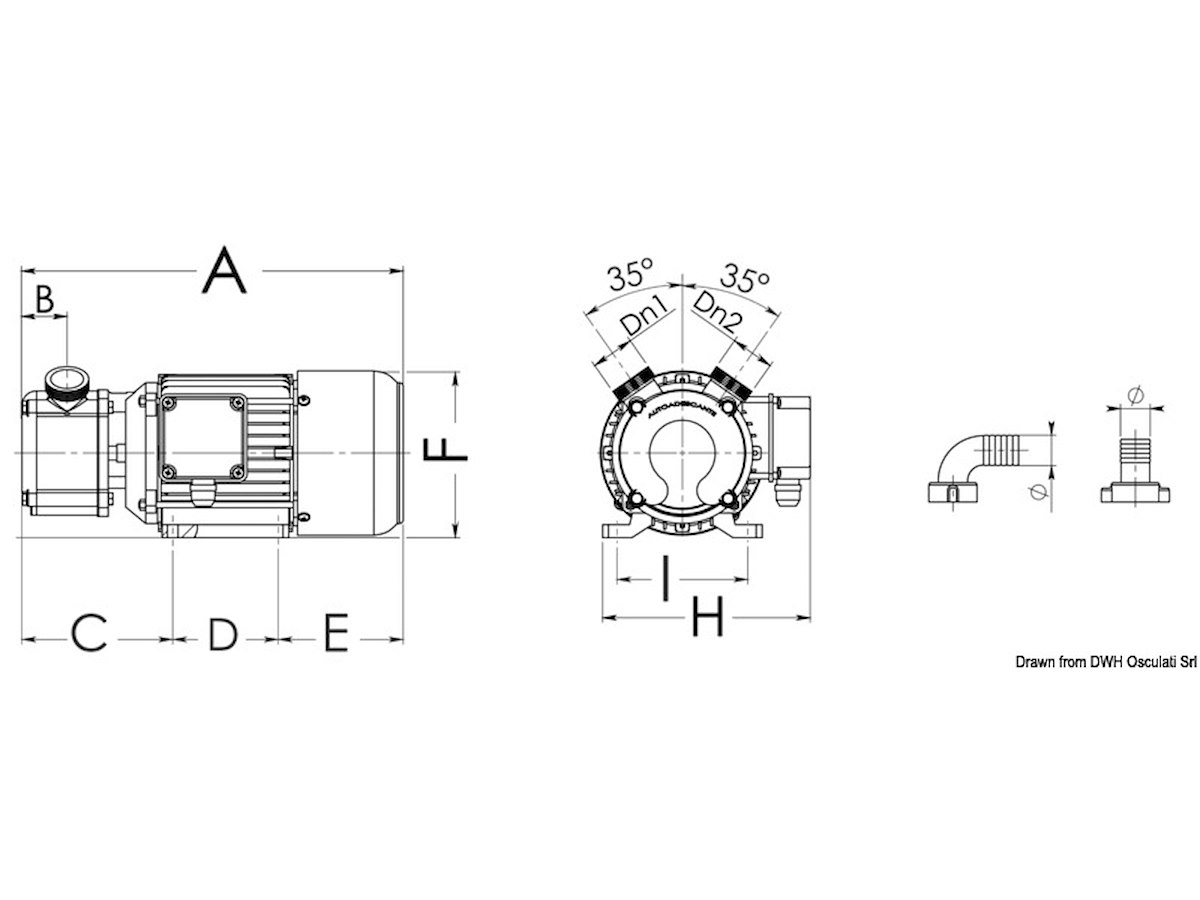 A mm: 375 B mm: 50 C mm: 140 D mm: 100 E mm: 135 F mm: 156 H mm: 205 I mm: 125 Dn1-Dn2: 1" 1/4 M V: 24 Portata l/min: 75 Consumo A: 24 Prevalenza m: 18 HP: 0,8 Ø portagomma mm: 30 peso : 13,5